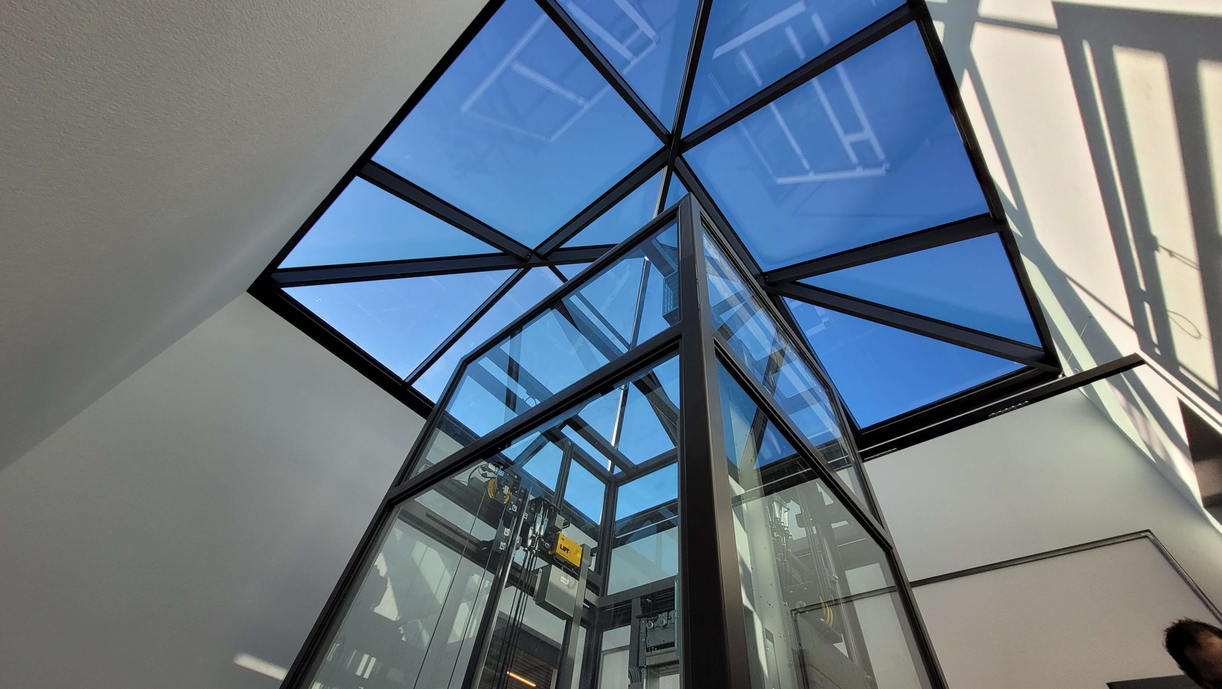 Treppenhaus mit Glas-Aufzug und Glas-Pyramide